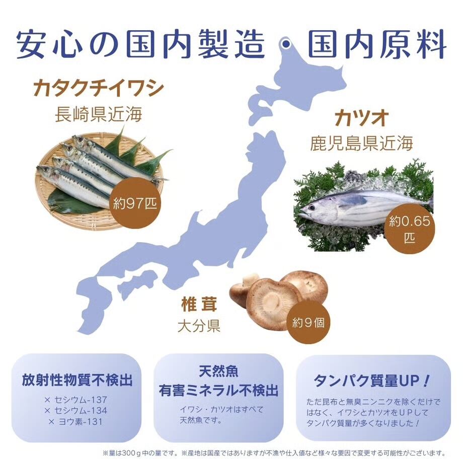 澱粉分解物(キャッサバイモ由来・国内製造)、イワシ(国産)、カツオ(国産)、椎茸(国産)