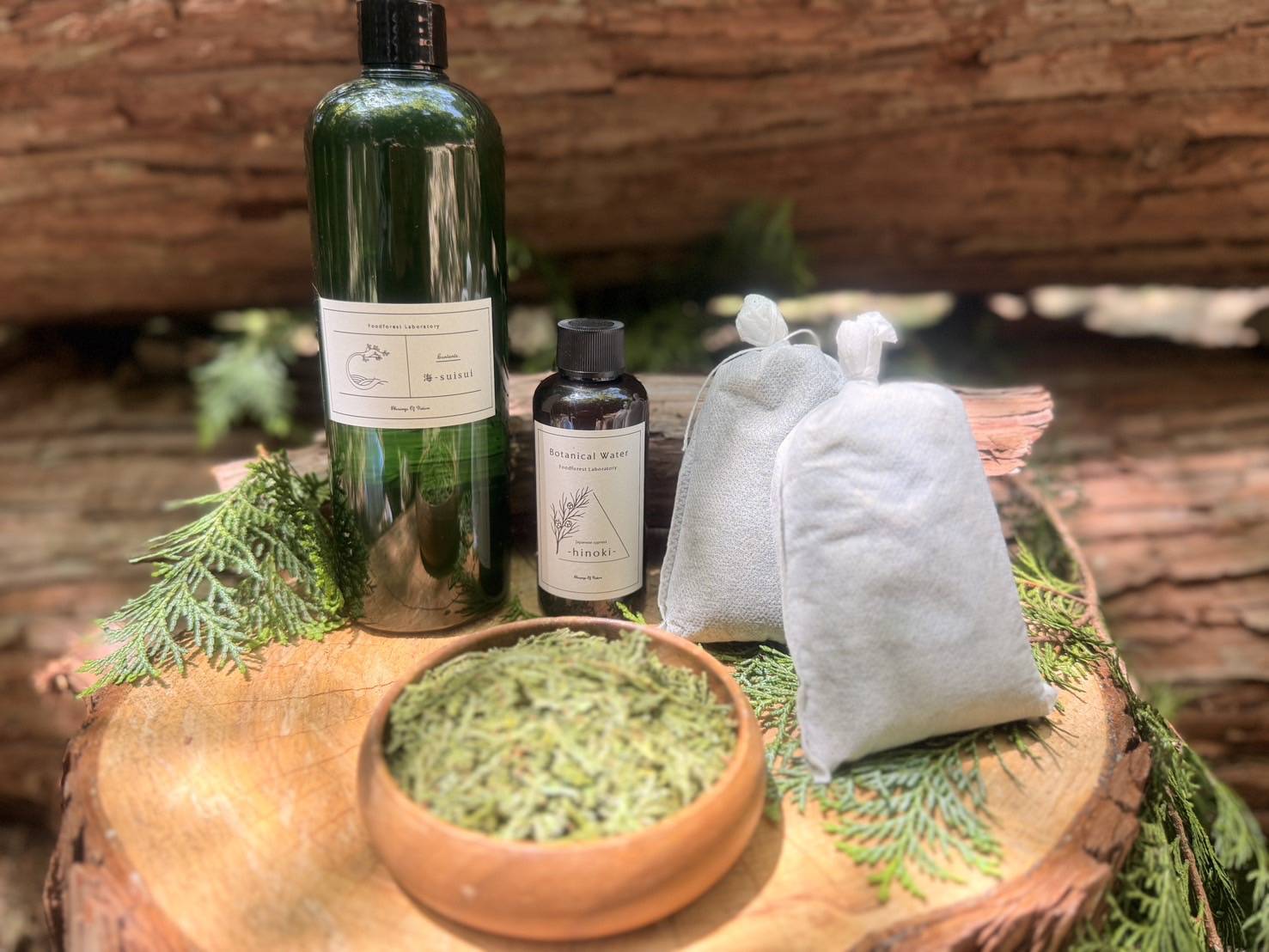 ヒノキ葉の採取は山で大木を切り倒し、葉は茎から丁寧に取り外し葉のみから、Botanical Waterとドライリーフを作りました。