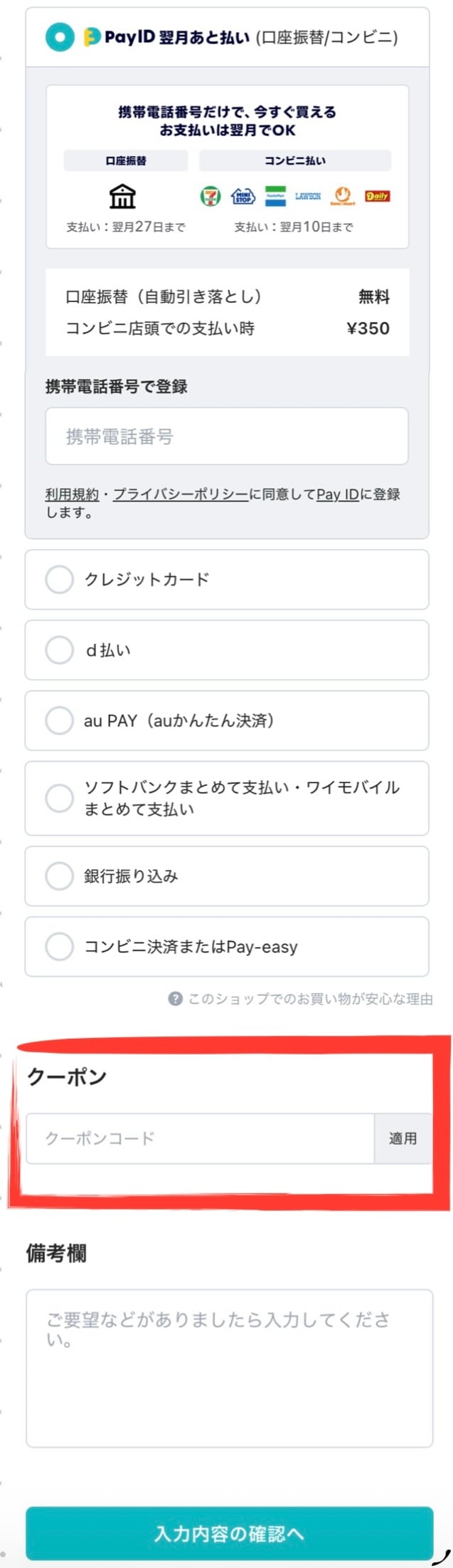 もし、クーポンコードを入力し忘れていたり、決済方法を変更したい場合には